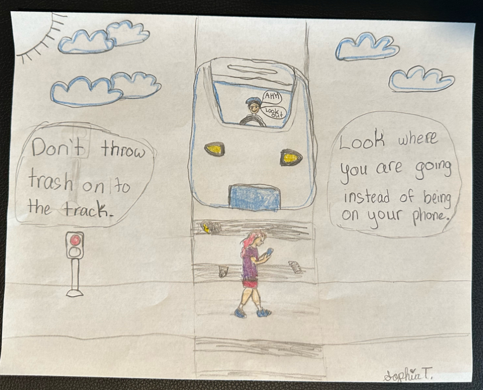“I made this poster because some people get injured or die because they don’t know these safety rules. Everyone should be aware of their surroundings and not be on their phones. Throwing trash onto the track is dangerous too because there can be fires.