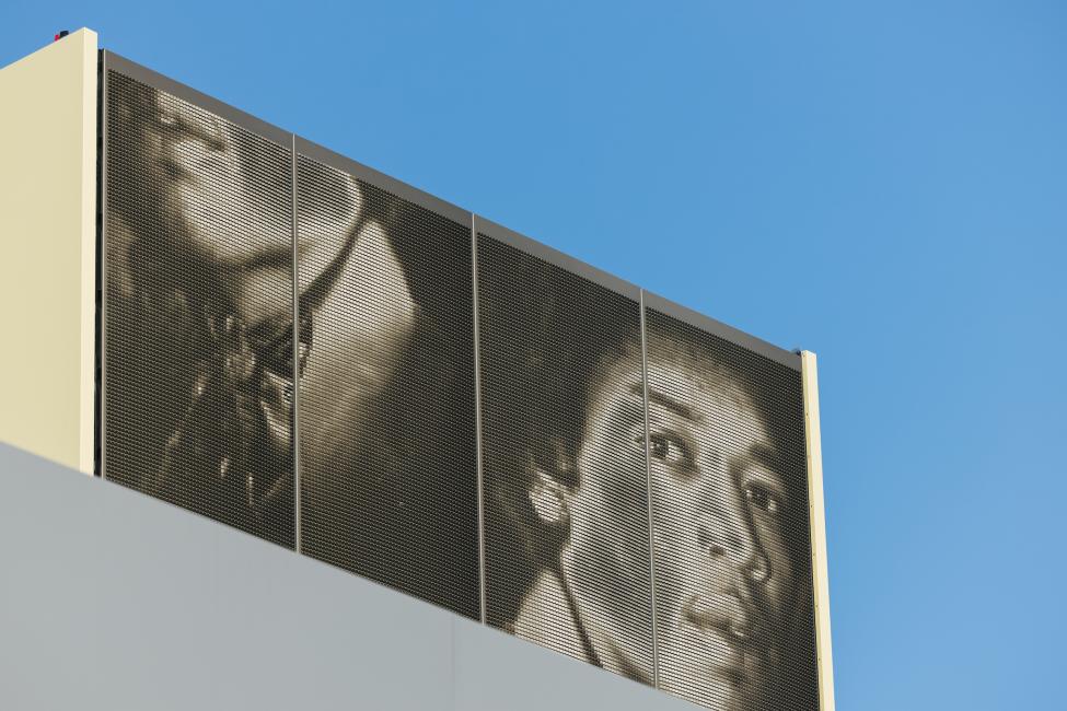 According to Thomas, the artwork “is a photomural based on two photographs of Jimi Hendrix using a hall of mirrors effect. Rendered in a halftone pattern, the image will read as a sharp, cohesive image from a distance and as abstract and reflective when viewed up close.”