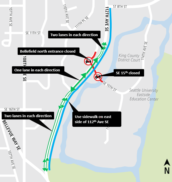 24 hours. During construction of the bypass road, 112th Ave SE will be reduced to one lane in each direction near SE 15th. People walking will continue to use the sidewalk on the east side of 112th Ave SE. The map below, details what people walking, driving and riding bikes can expect. Please follow the direction of flaggers and signage to safely access your destination.