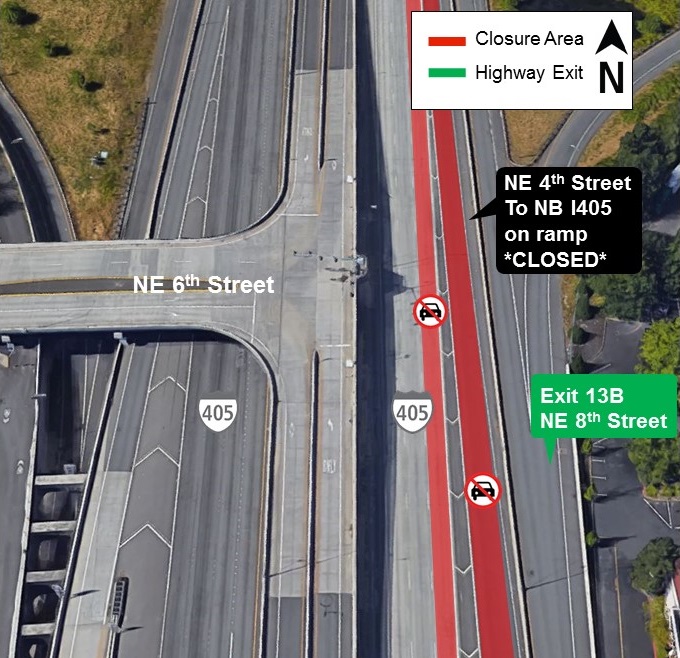 - The northbound I-405 off-ramp and the southbound on-ramp to and from Northeast 6th Street (9 p.m. – 5 a.m.) will be closed.