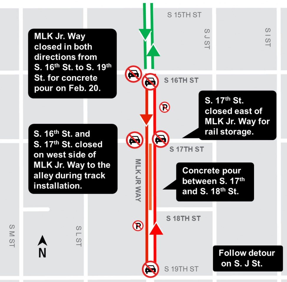 Martin Luther King Jr. Way from S. 19th to S. 15th Streets – southbound lane closure and full street closure. Crews moved rail into place on Martin Luther King Jr. Way from S. 18th Street to S. 17th Street. Crews continue the track installation process on MLK Jr. Way going north. The southbound lane on MLK Jr. Way is closed from S. 15th St. to S. 19th St. The contractor plans to pour concrete around the rail on Thursday, Feb. 20 from 9 am to 3 p.m. During this time, MLK Jr. Way will be closed in both directions from S. 16th St. to S. 19th St. In addition, S. 16th St. and S. 17th St. are closed on the west side of MLK Jr. Way to the alley. Please follow the detour on S. J St.