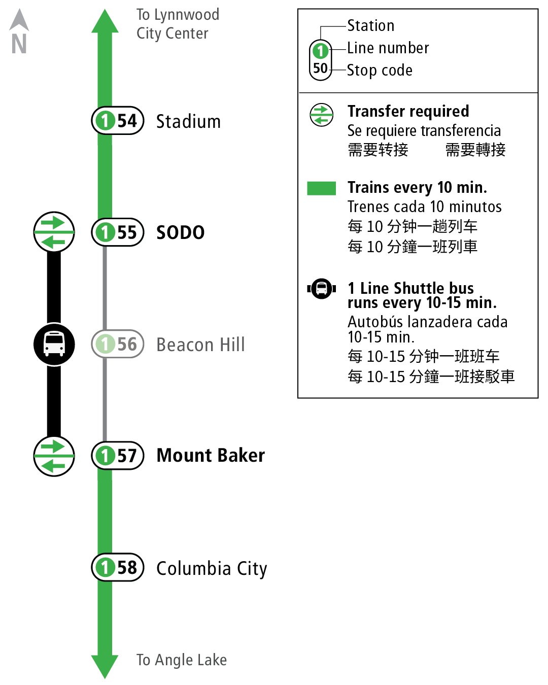 1 Line shuttle buses will run every 10-15 minutes between SODO, and Mount Baker Stations.