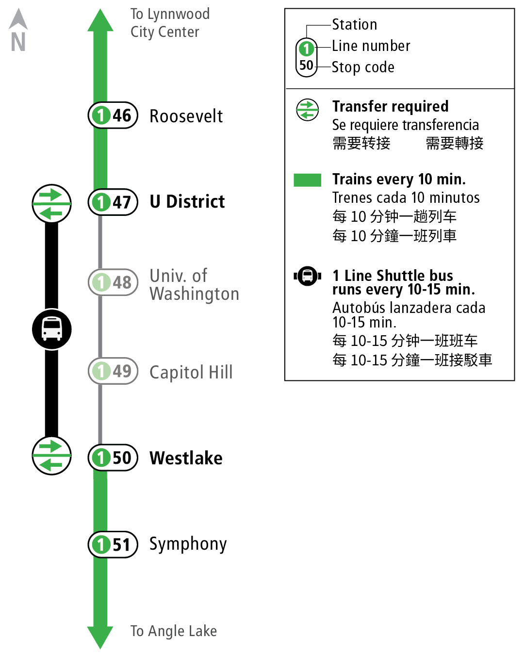 - From start of service until 2 p.m., 1 Line service will be suspended between Westlake and U District stations. Riders will have to transfer to a 1 Line shuttle bus at U District and Westlake stations. You can find a map of the disruption here.